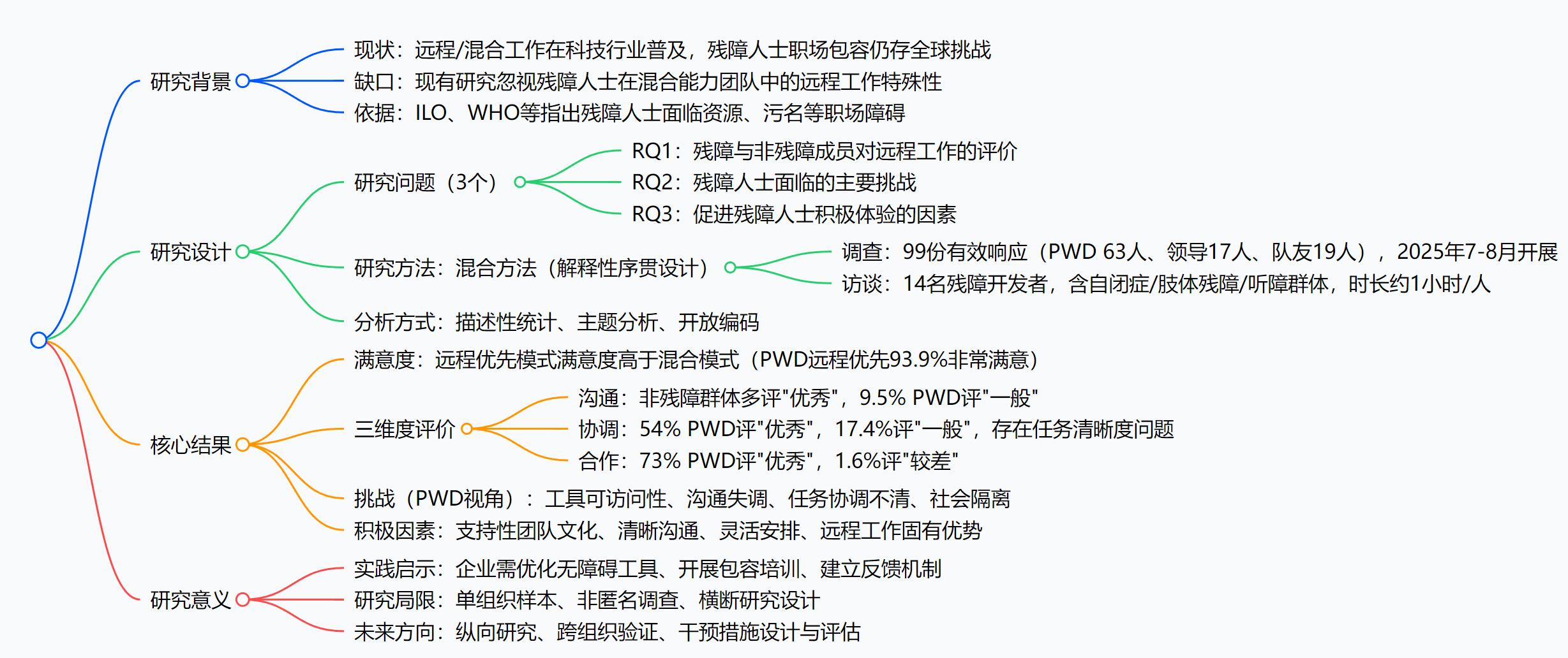 - 填补研究空白:首次系统揭示混合能力软件开发团队中残障人士的远程工作体验,让"隐形障碍"显性化,解决了此前研究忽视残障群体特殊性的问题。