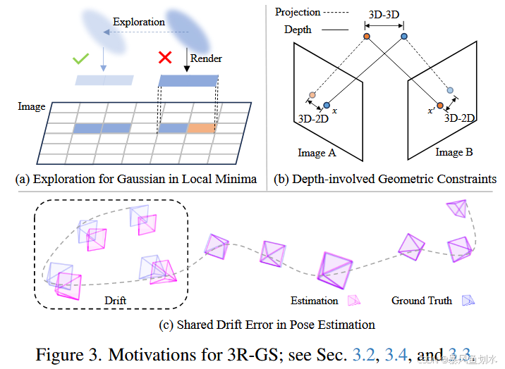 为了利用这些对应关系,常见的选择包括 3D-2D 投影损失和 3D-3D 损失,两者都依赖于深度,如图 3(b) 所示。 3D-3D 损失通过使用深度和相机参数将图像对中的对应点反向投影到 3D 空间来计算图像对中对应点之间的距离; 3D-2D 损失将这些 3D 点重新投影到图像平面上,以计算与其对应的 2D 距离。这些方法通常需要多个图像对来模拟全局捆绑调整,以确保梯度更加一致。然而,将这些优化目标集成到 3DGS 训练中会带来重大挑战,主要是因为 3DGS 采用透视深度排序进行渲染(RGB 和深度),并且需要数万次迭代进行训练。这种计算限制严重限制了每个步骤中可以处理的视图数量。合并额外的视图会大大增加训练时间和内存消耗到令人望而却步的水平。因此,在应用上述几何约束时,每个步骤只能考虑图像对的子集,从而阻止执行真正的全局目标并最终导致次优结果。