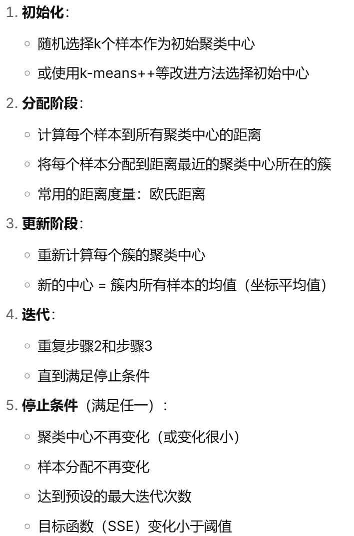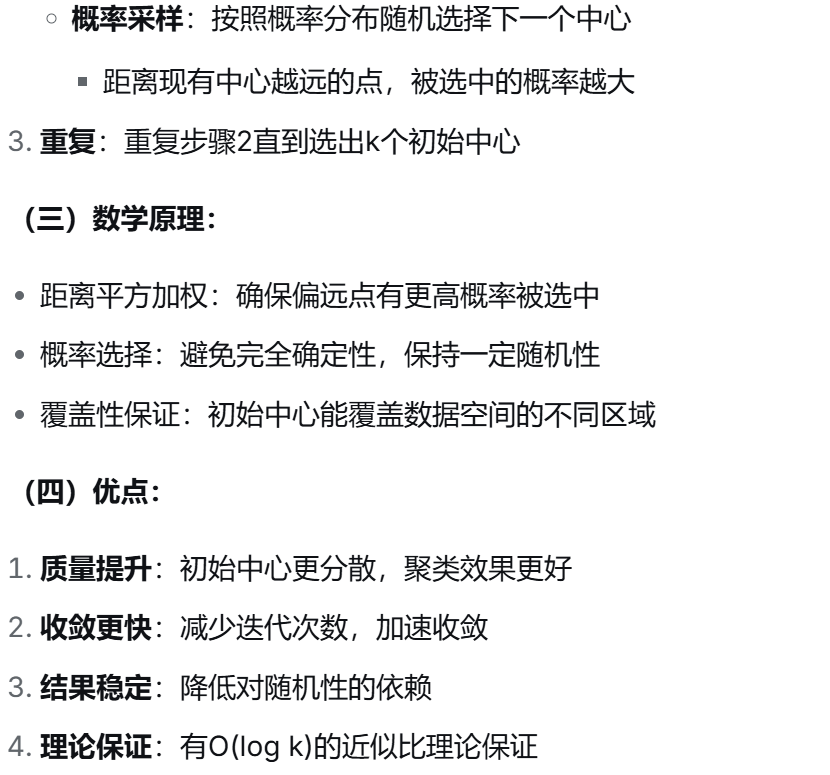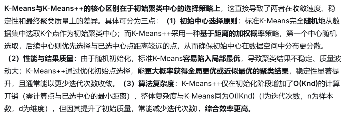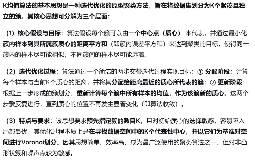 1.在算法效率上,它原理简单、实现容易、计算复杂度低,适合大规模数据;2.在收敛性能上,迭代次数少且收敛速度快;2.在扩展性上,支持分布式实现和小批量在线学习;3.在结果可解释性上,聚类中心作为簇的代表点便于理解和可视化。