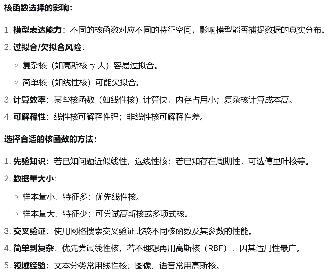 (10)说明核函数选择对支持向量机性能的影响,以及如何选择合适的核函数。