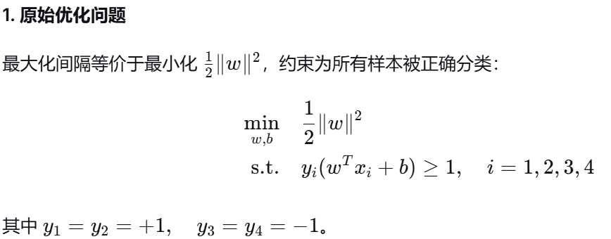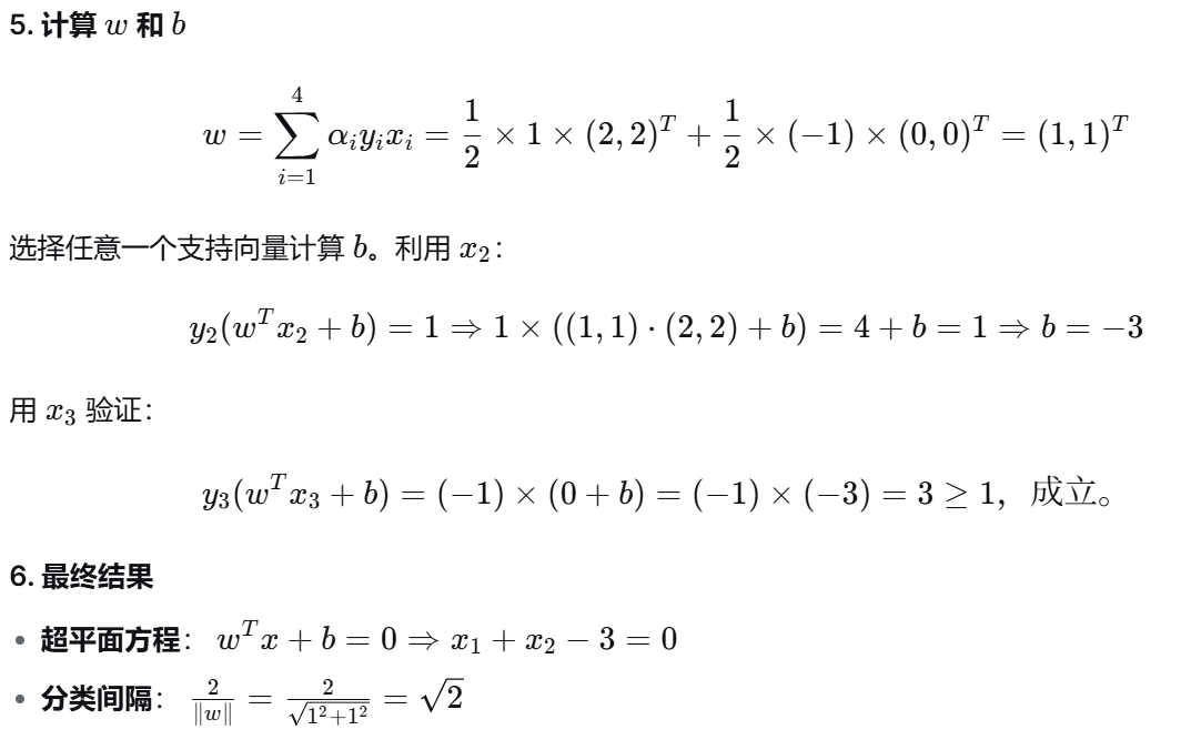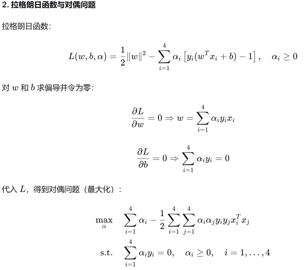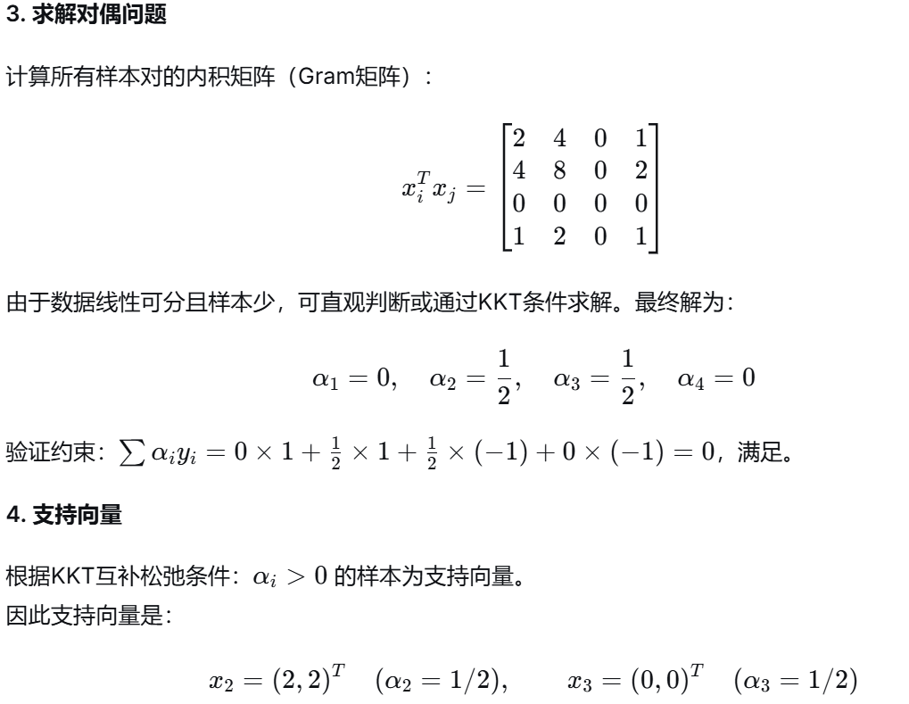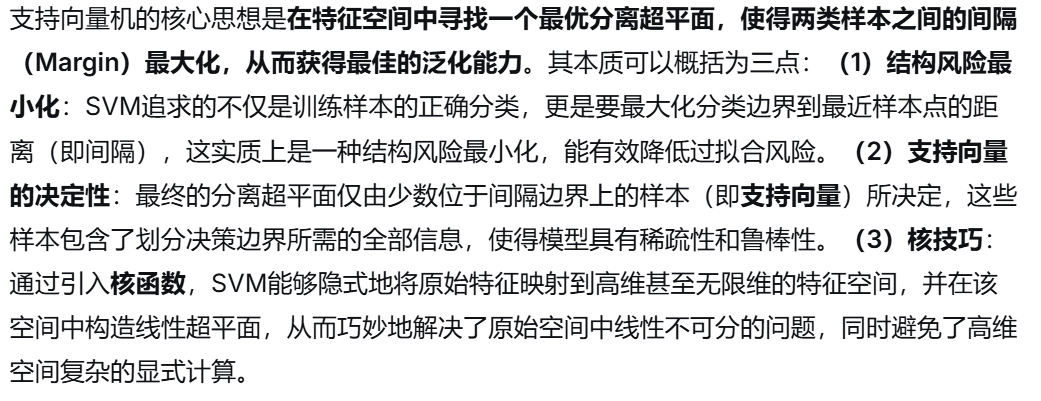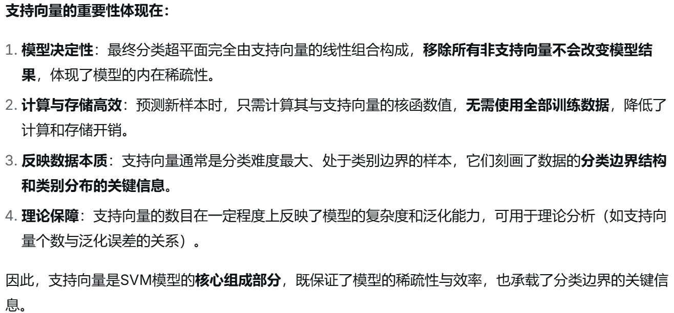 (1) 支持向量 :是训练样本中那些位于最大间隔边界上或误分类一侧 的样本点。它们是决定最终分离超平面的关键样本 ,其对应的拉格朗日乘子 αi>0。支持向量之外的样本对模型没有影响,这赋予了SVM解的稀疏性。