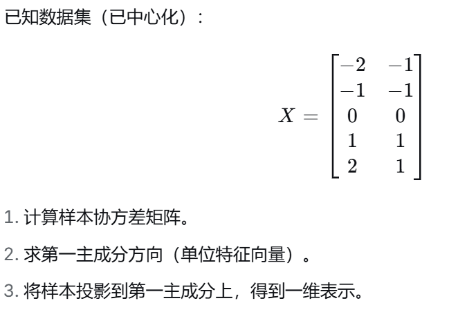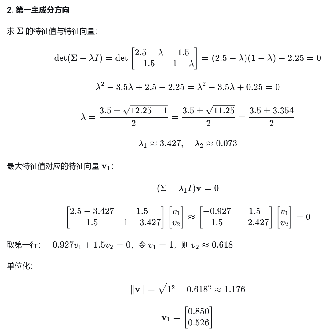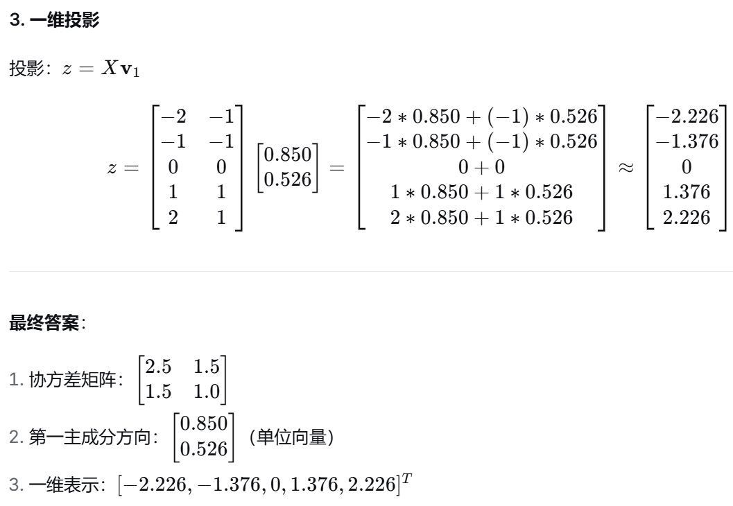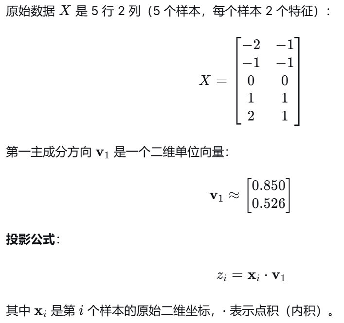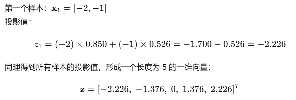 几何意义:把二维平面上的点投影到一条直线(第一主成分方向)上,投影点的坐标就是 z。