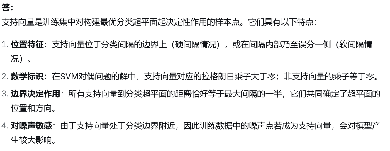 (4)描述支持向量机中支持向量的特点,并说明为什么支持向量对于模型很重要。