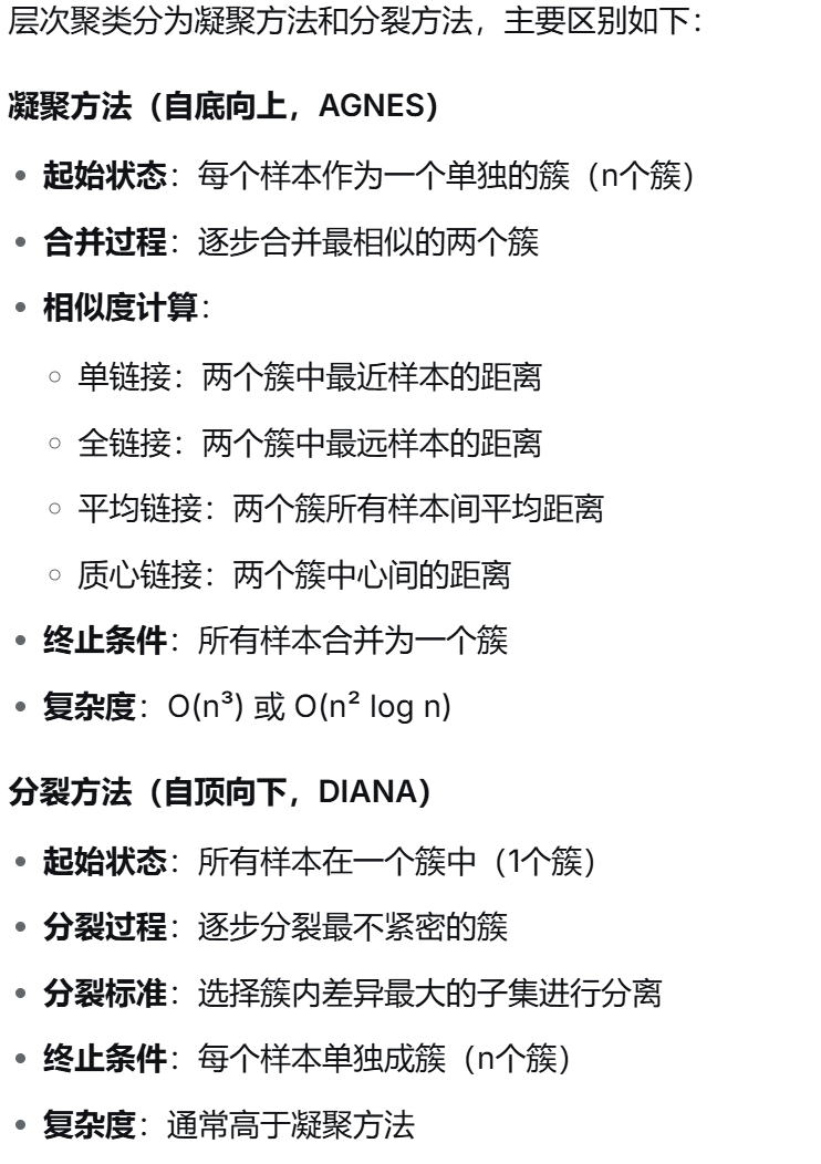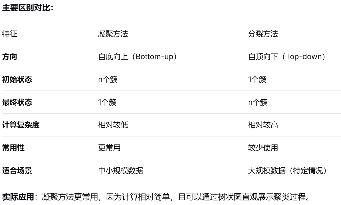 (11)解释层次聚类中"凝聚"和"分裂"两种方法的区别。