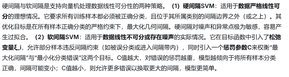 (2) 间隔平面与间隔带 :支持向量机旨在找到两个平行的间隔边界 (或称间隔平面),它们分别穿过各自类别中离决策超平面最近的样本点(即部分支持向量)。这两个间隔边界之间的整个空间区域,称为间隔带 。两个间隔边界之间的垂直距离称为间隔 。最优超平面(决策面) 就位于这个间隔带的正中央 。最大化这个间隔带的宽度是SVM提升泛化能力的关键,它为分类决策提供了一个鲁棒的"安全缓冲区"。
