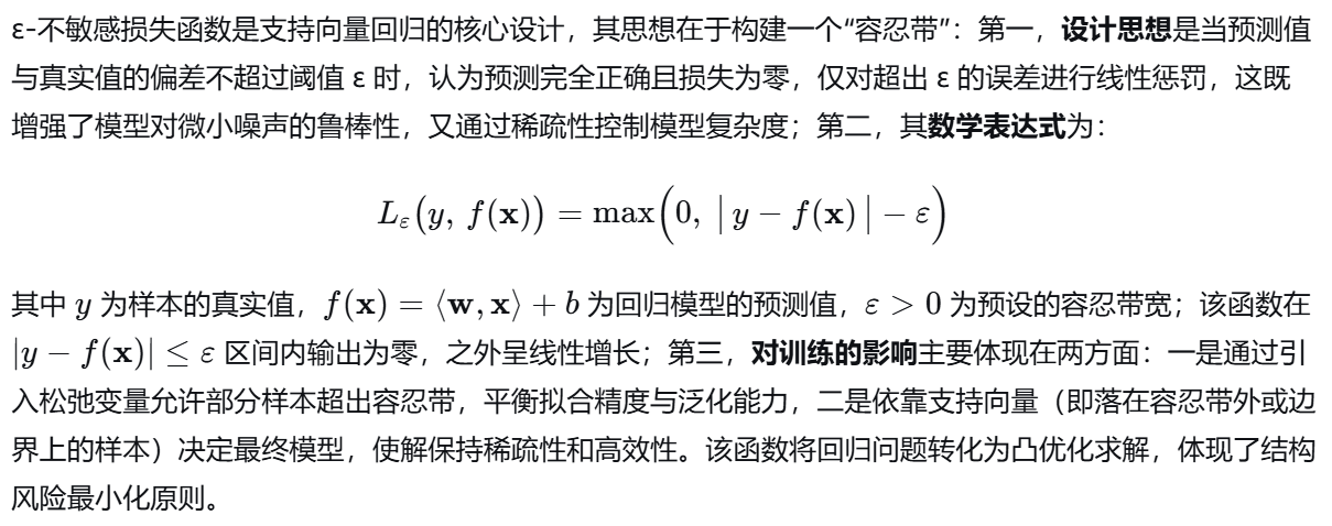 (11)在支持向量回归中,简述ε-不敏感损失函数的设计思想、数学表达式及其对模型训练的影响。