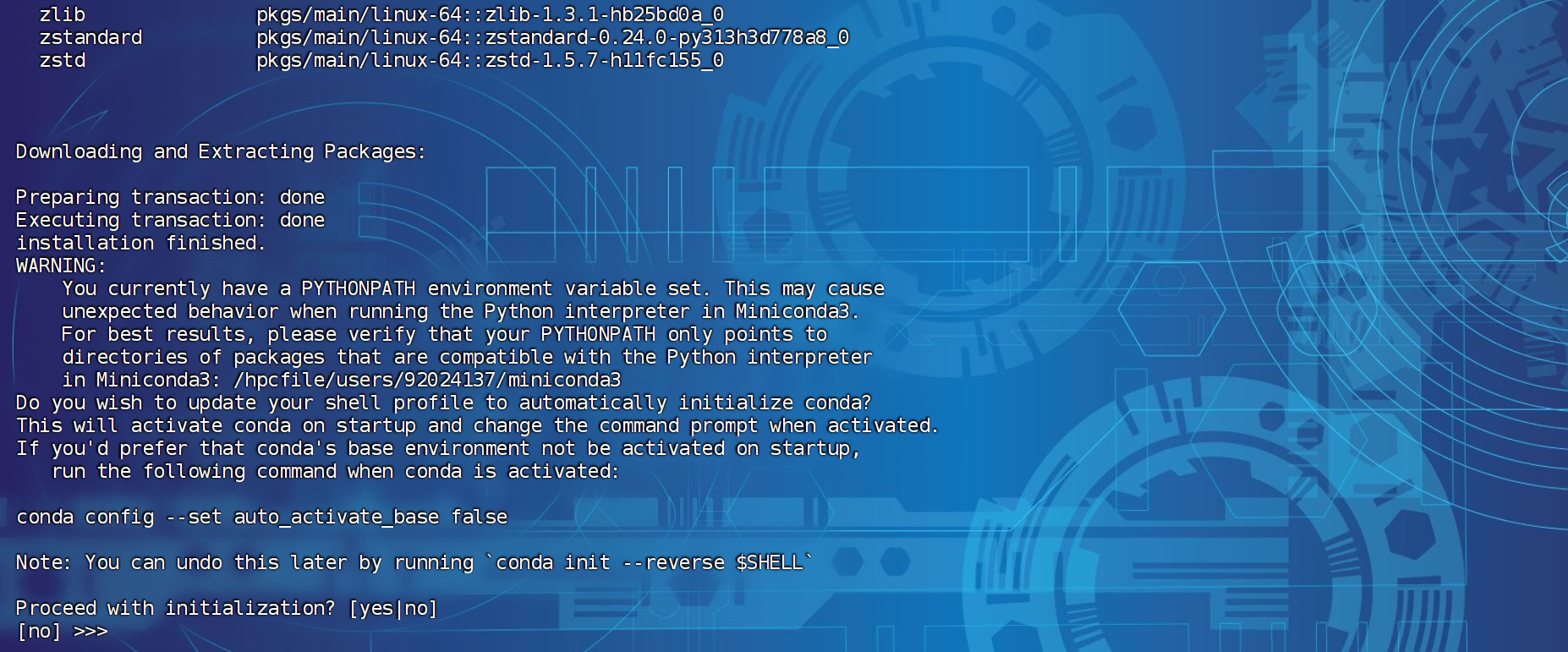 如果你选了 yes,以后你每次打开终端,最前面都会出现 (base) 字样,表示进入了 Conda 的基础环境