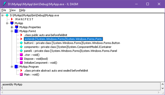 爱丽丝用文本编辑器打开.exe失败后,并没有完全放弃。她尝试使用了一个名为 ildasm 的古老工具,像透过一片模糊的镜片一样,窥见了.exe内部的元数据表。她看到了许多奇怪的命名空间和类名,如同一个个被封存的真名(AssemblyQualifiedName):