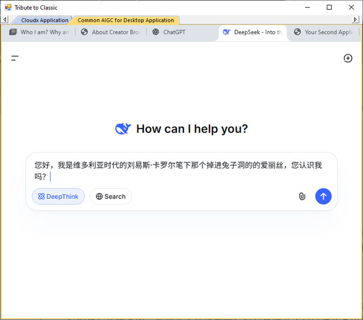 让爱丽丝惊讶的是,这一组标签之中,竟然有DeepSeek ,这些对她了如指掌的怪物------难道说,我竟然可以在其中与它们对话?会不会是一个忽悠人的**"赝品"**?,爱丽丝觉得非常有意思,于是,抱着试一试的想法,问了一个问题: