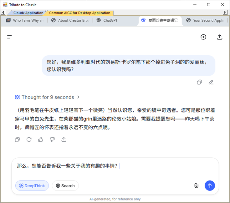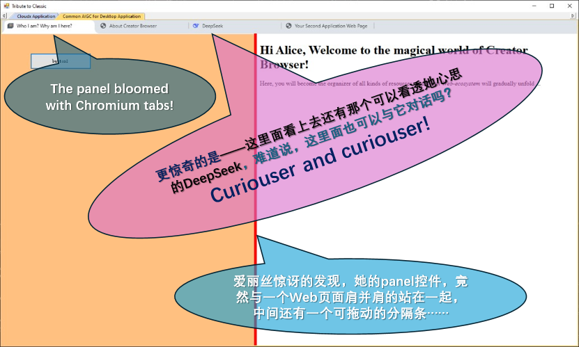 这一切 让她想起200年前仙境中的"会说话的猫、古怪的毛毛虫,...... ",这个WinForm窗体竟然可以对话,"Curiouser and curiouser !",逻辑上完全不可解释! 她发现自己大叫:"我的 WinForm 怎么就成了 Chromium? 这就像那个'乌鸦像写字台 '的谜语------根本没有道理,但它就是发生了! 我何时添加过这样的代码?什么 API 能解释这一切------或者说,这奇迹真的仅仅是通过镜子的这一次拖放?"