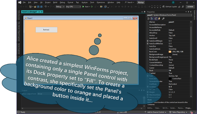 WinForm窗体之中只有一个面板,里面仅添加了一个button,面板的Dock 属性设为 Fill,爱丽丝的想法是: