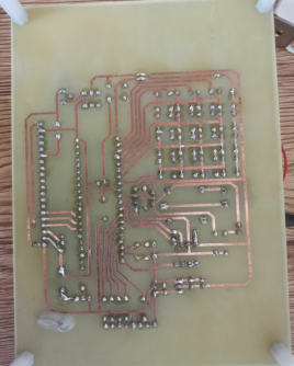 由于本设计的布线比较复杂,在焊接之前要细心地研究电路图,防止焊接位置错误。如果在焊接时焊锡不够用,加焊锡时要格外小心,因为如果加太多的话,用电烙铁继续焊接时就容易因为焊锡过多而不小心牵连到其它器件。如果遇到焊锡过多的问题,可以用电烙铁放在焊接处来回滑动,这样电烙铁就会将多余的焊锡带走,去除焊锡的另外一个方法是吸锡器,使用十分方便。焊接完毕后的实物图如图4.1所示。