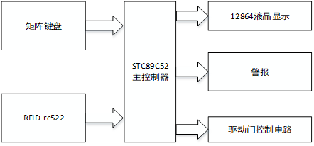 (2)液晶显示模块:LCD12864液晶显示屏,接收密码识别模块和射频识别模块的信息,显示密码或RFID卡是否正确,是否可以通过;