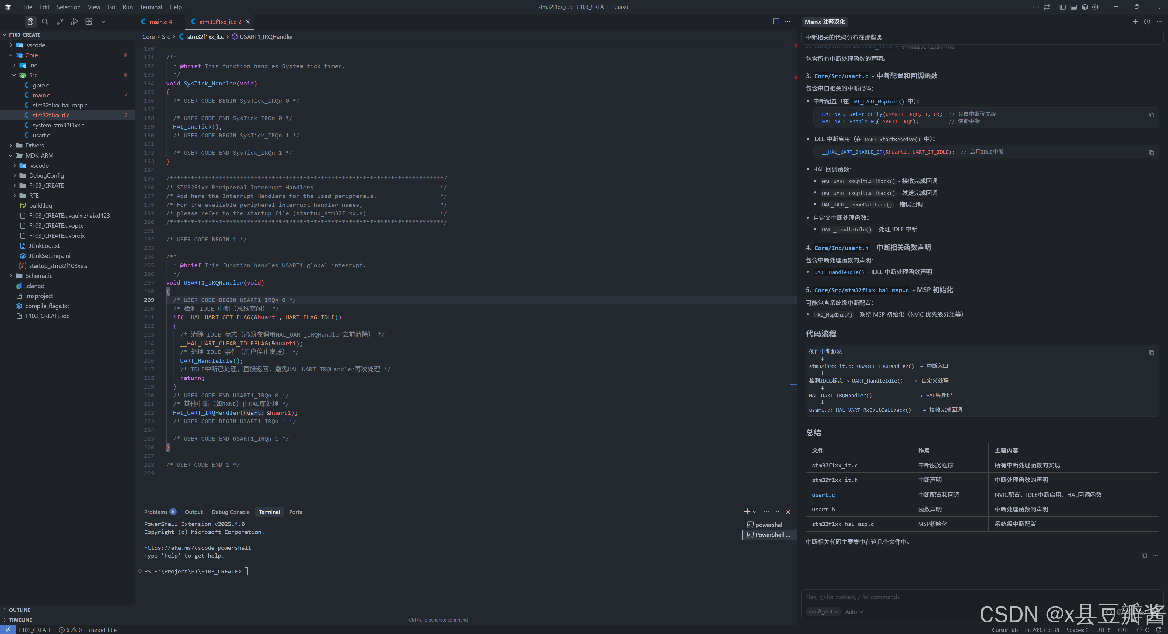 结合上文,我们使用stm32cubeMX生成了项目,我们直接使用cursor打开文件夹即可,然后就可以使用对话框让cursor做任何你能想得到的事情,包括理解整个项目,操作本地文件。