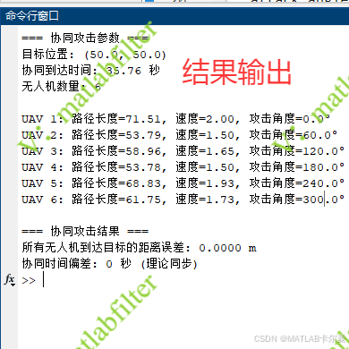 - 最终结果包括所有无人机到达目标的距离误差和协同攻击的时间偏差。