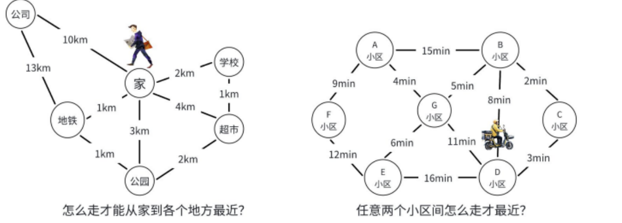 由于 v i 到 v j 的路径可能有多条,将带权路径⻓度最短的那条路径称为最短路径。