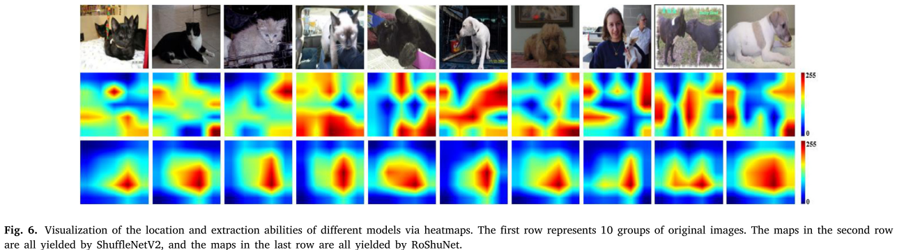 在Kaggle猫狗数据集的可视化中(Fig. 6),RoShuNet不仅能准确定位目标,还会重点关注识别性强的区域(如动物的脸、四肢),而ShuffleNetV2的注意力分布则显得"心不在焉"。