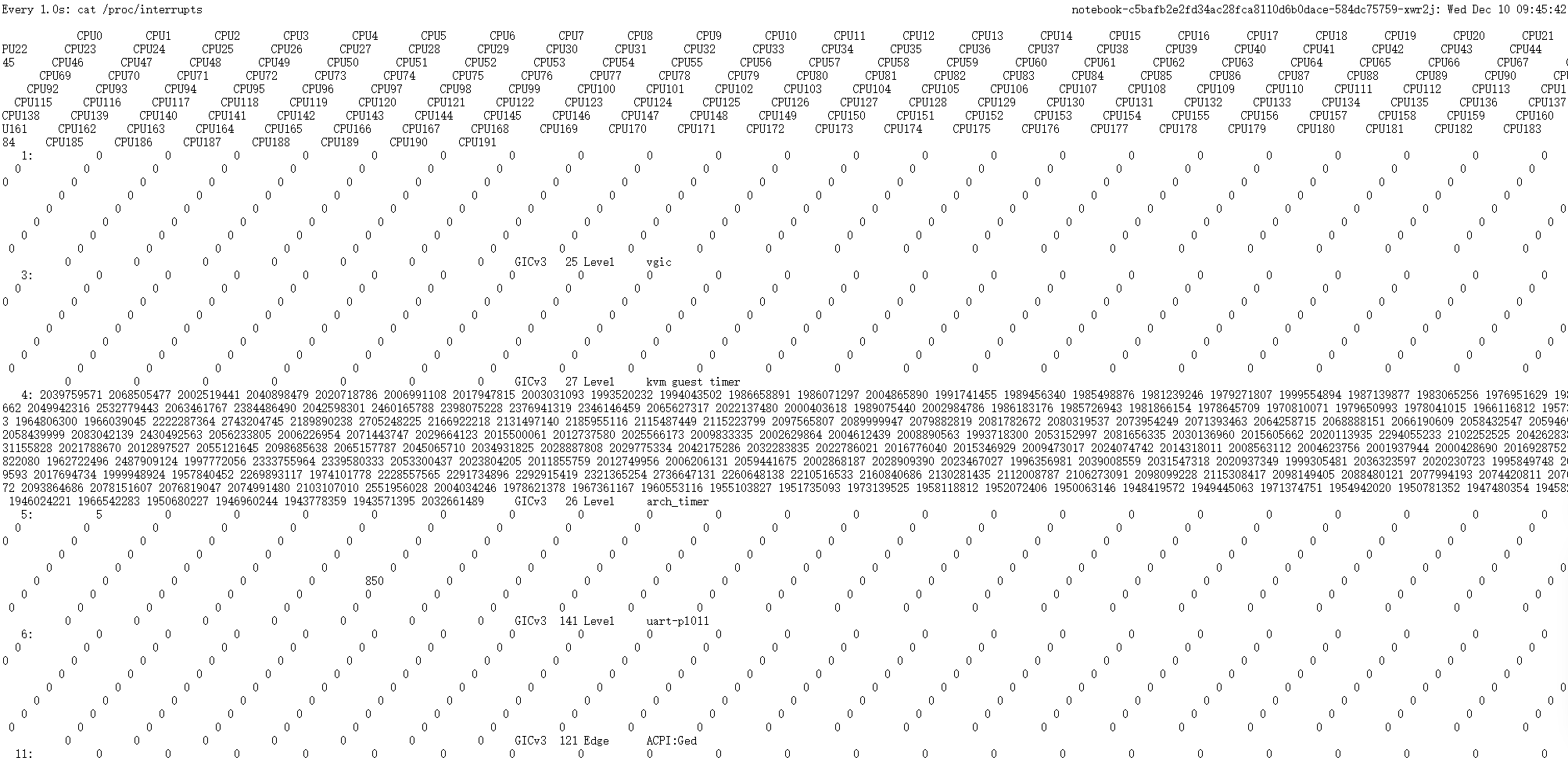 在实际大模型推理环境中,你可以通过 cat /proc/interrupts 实时观察到某些中断(例如 sq_send_trigger_irq、cq_update_irq)在某几个 CPU 上触发频率极高。 这通常说明这些中断源被固定绑定在特定 CPU 核上,如果你的推理线程也恰好绑定在同一核,就会造成频繁的中断抢占,进而引起 HostBound 性能瓶颈。