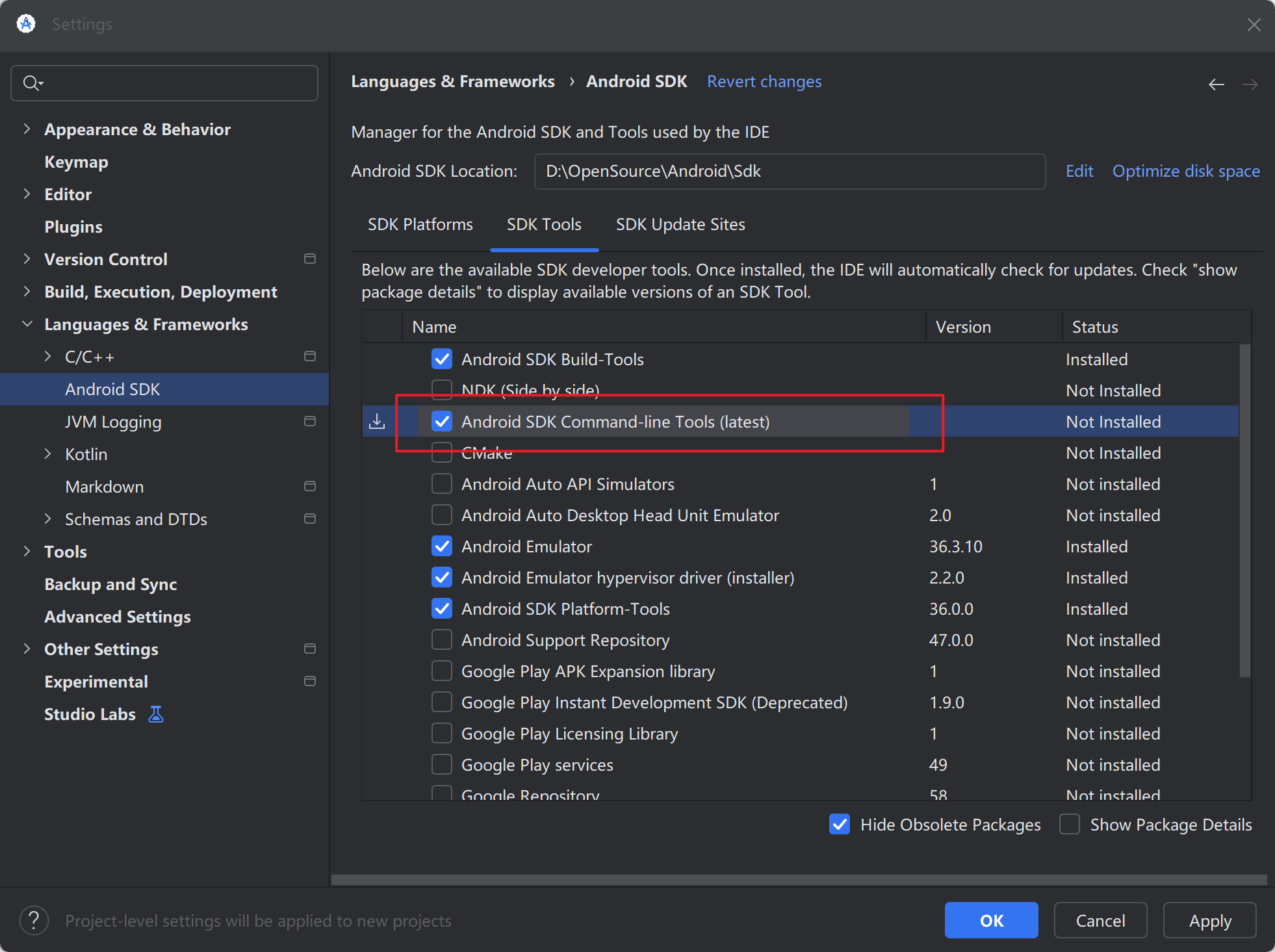 - 勾选 "Android SDK Command-line Tools (latest)"