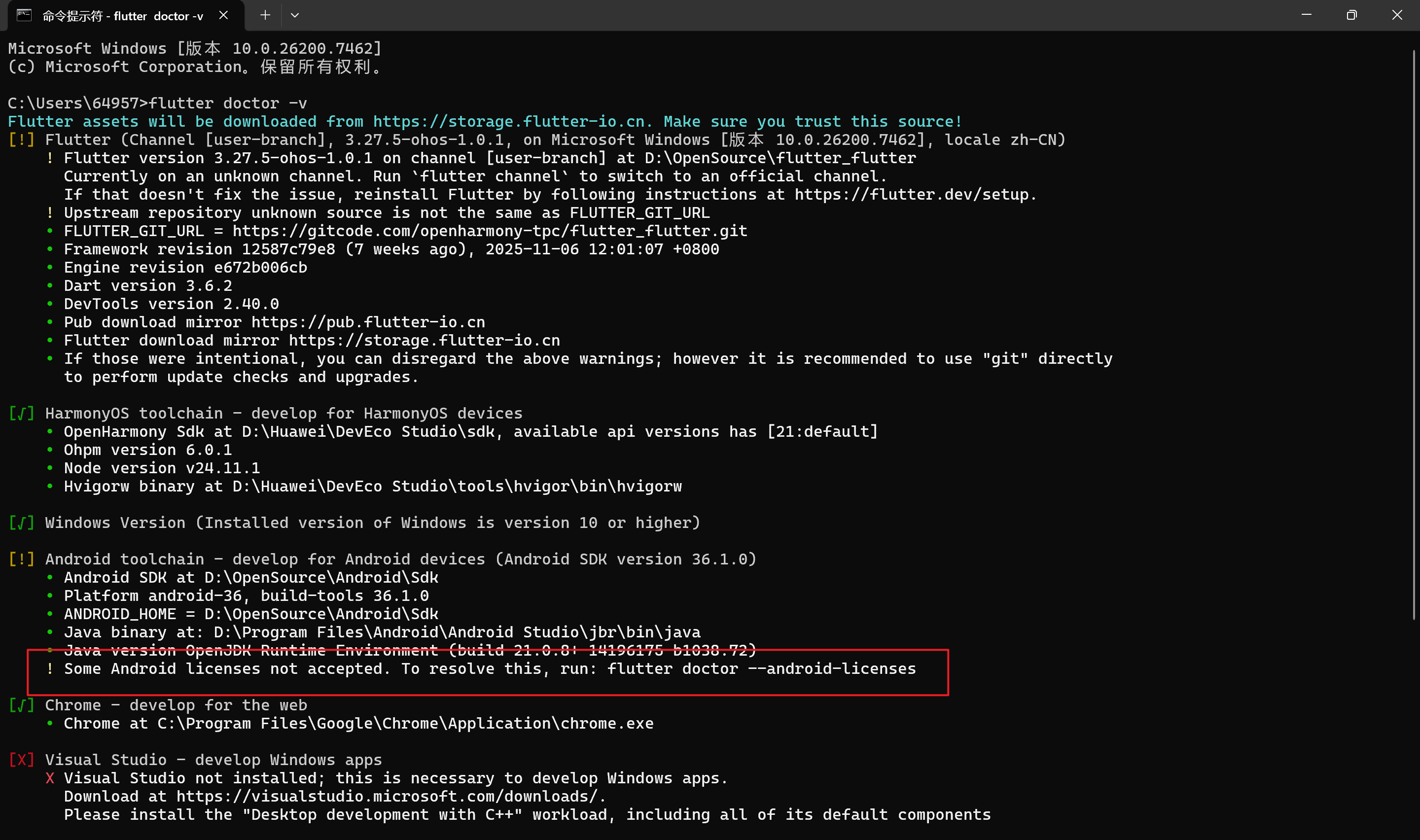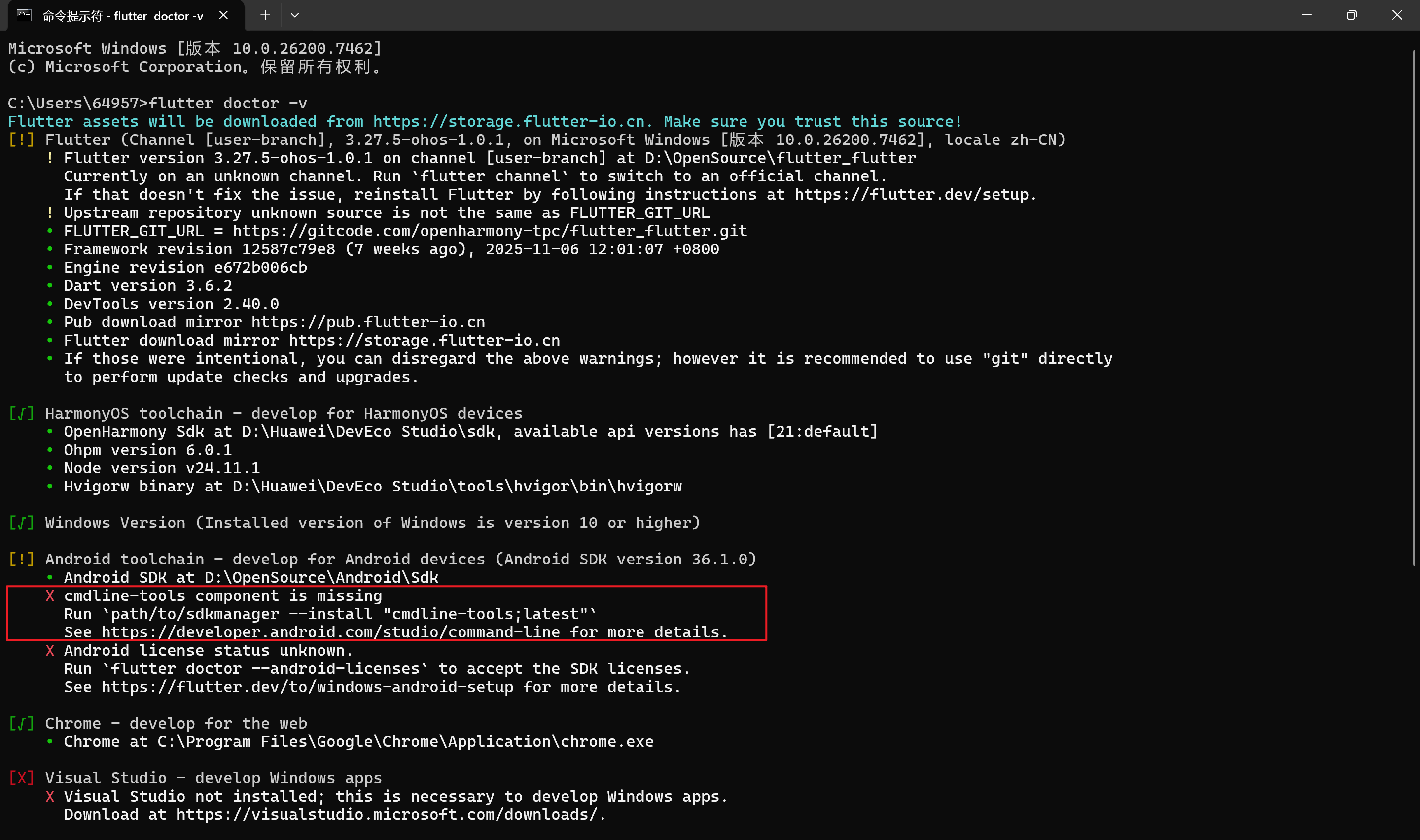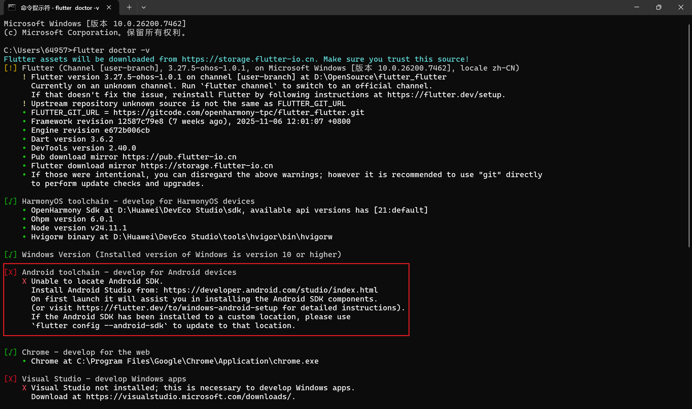 问题描述 :运行 flutter doctor 时提示找不到 Android SDK。