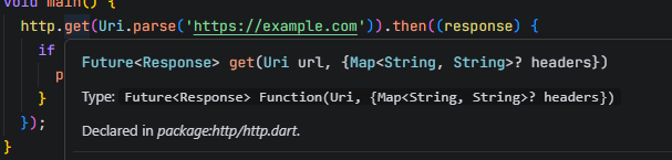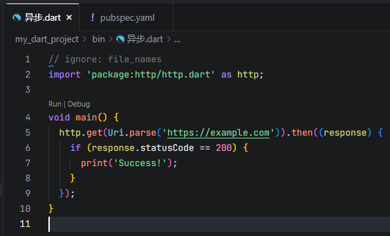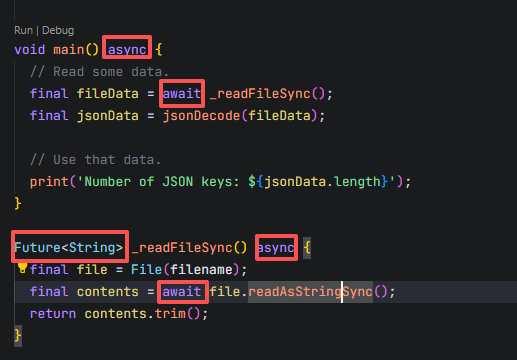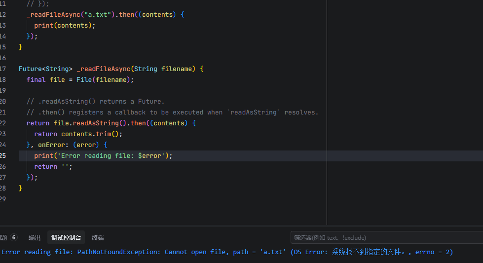 main () 函数在_readFileAsync () 前使用 await 关键字,以便在原生代码(文件 I/O)执行时,让其他 Dart 代码(如事件处理程序)能够使用 CPU。使用 await 还有一个作用,就是将_readFileAsync () 返回的 Future<String>转换为 String。因此,contents 变量的隐式类型为 String。