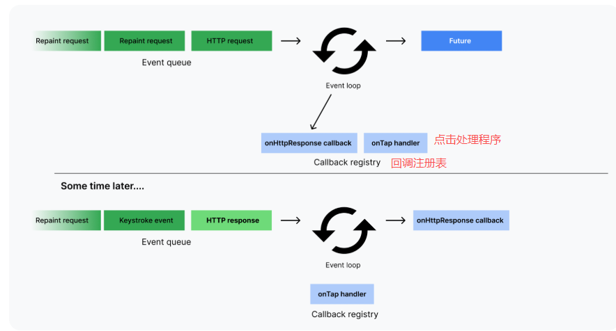 Dart 中的事件循环处理所有其他异步事件(例如 Stream 对象)时,通常采用的就是这种相同的模型。