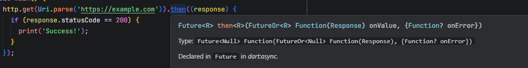 当这段代码进入事件循环时,它会立即调用第一个子句 http.get,并返回一个 Future 对象。它还会告知事件循环,在 then () 子句中的回调函数要一直保留,直到 HTTP 请求完成解析。当请求解析完成后,事件循环就会执行该回调函数,并将请求的结果作为参数传入。