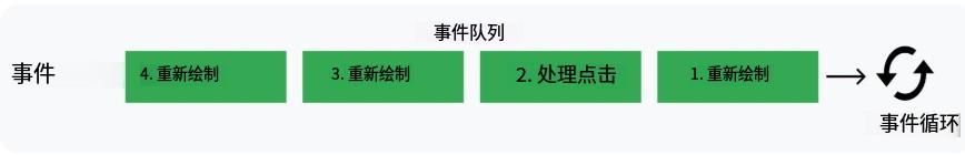 在客户端应用中,主隔离区的事件队列可能包含重绘请求以及点击和其他 UI 事件的通知。例如,下图展示了一个重绘事件,随后是一个点击事件,接着是两个重绘事件。事件循环按照先进先出的顺序从队列中获取事件。