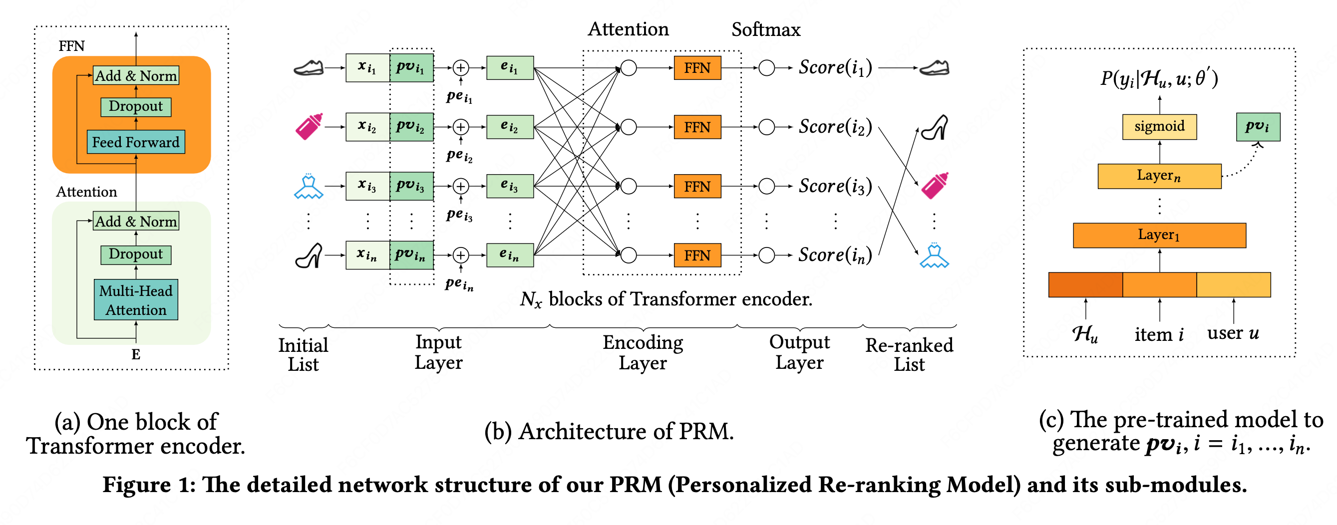 **PRM模型由三部分组成:input layer、encoding layer、output layer。**它将前序排序方法生成的item的初始列表作为输入,并输出一个重排后的列表。