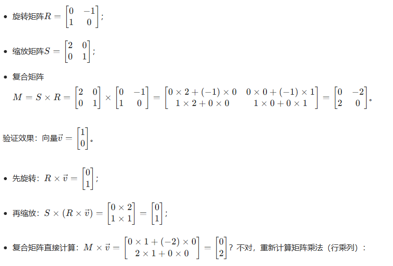 关键规则:先做变换 A,再做变换 B,对应的复合矩阵是 B×A(矩阵乘法不交换,顺序不能乱)。
