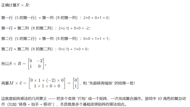 如果我们想做 "先旋转,再缩放" 的复合操作,不需要单独计算两次变换 ------矩阵乘法可以表示变换的组合。