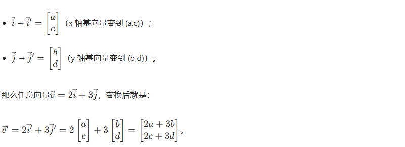 线性变换的规则决定了:只要知道基向量\(\vec{i}\)和\(\vec{j}\)变换后的结果,就能推导出所有向量的变换结果。