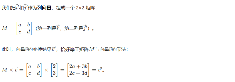 矩阵是线性变换的 "数学编码",矩阵的列是基向量变换后的坐标,矩阵与向量的乘法是 "应用这个变换"。