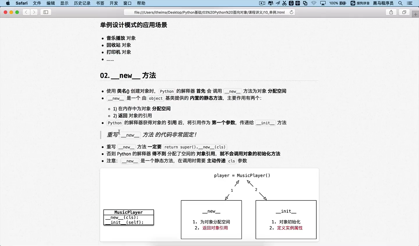 object)的__new__方法:super().__new__(cls),为MusicPlayer实例分配内存空间,返回实例的引用(instance)。 __new__方法返回实例引用,这个引用会作为self参数传递给__init__方法。