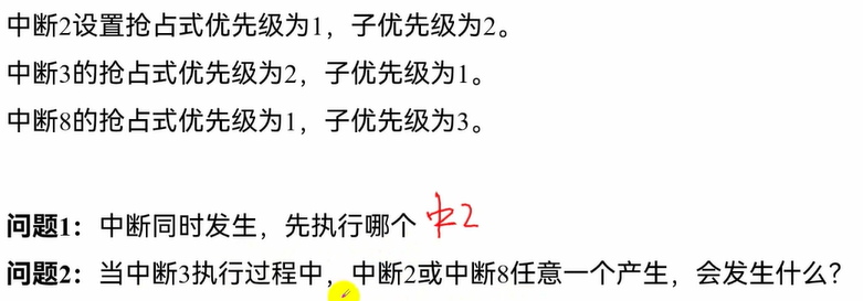 如果中断都来了,哪个中断先执行,如果正在中断,再来一个中断会怎样?