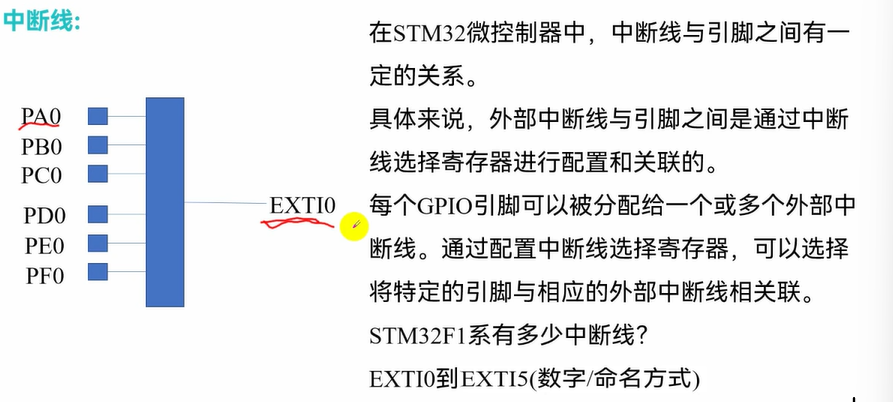 选择中断线和引脚:确定要使用的中断线和相应的引脚。在 STM32 中,不同的引脚可以与不同的中断线相关联。