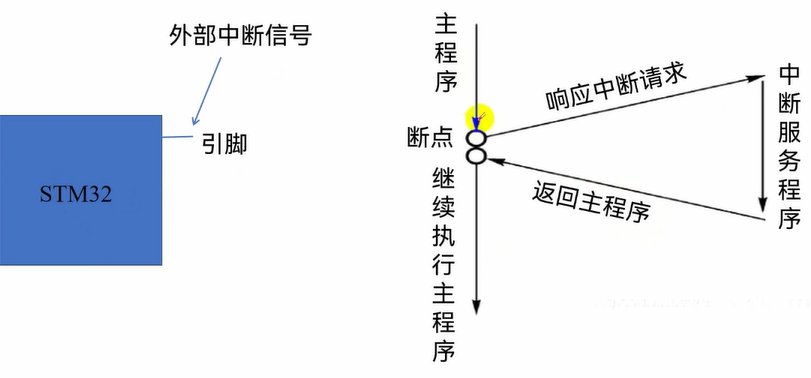 中断允许微控制器在执行程序的过程中, 根据需要暂停当前任务,处理中断事件,然后返回到原来的任务继续执行。