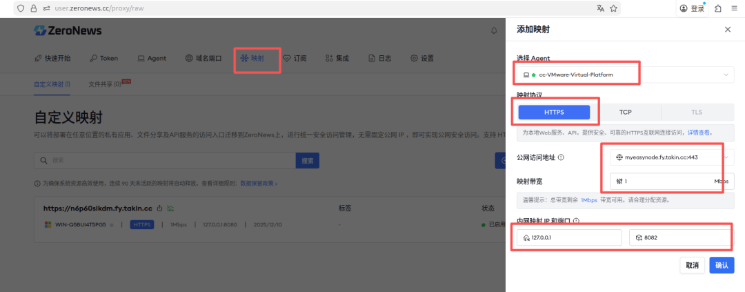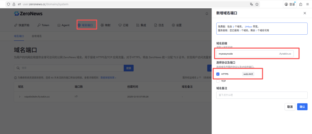 ③ 接着,我们在域名端口页面,创建一个可用的公网域名(可自定义前缀),并勾选HTTPS 协议。