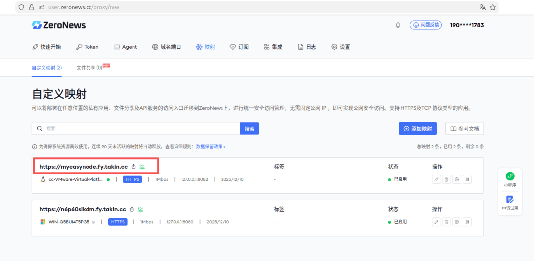 ⑤ 按照上述步骤创建完成之后,我们就可以得到一条可公网访问的映射域名。