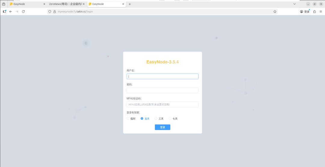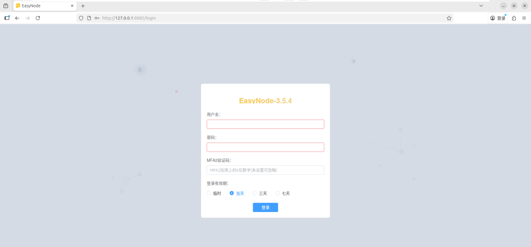 ② 安装完成后,在浏览器输入 127.0.0.1:8082,就可以打开 EasyNode 的 Web 管理页面。
