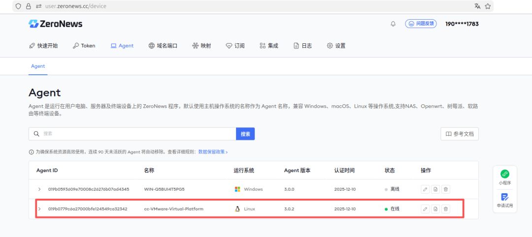 ② 运行完成之后,您可以在 Agent 页面看到已经在线的 Agent 服务。