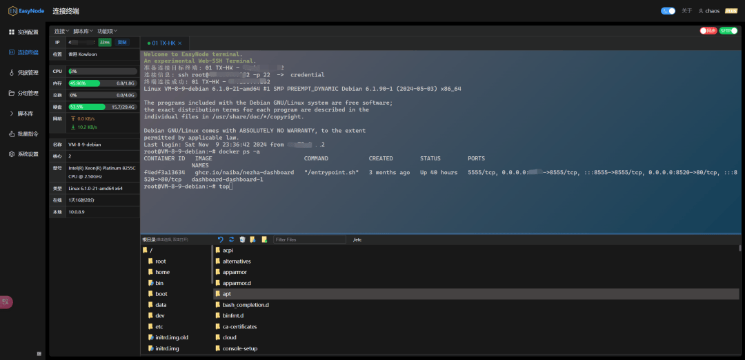 EasyNode 是一个基于 Web 的多功能 Linux 服务器管理面板,提供 WebSSH 终端和 WebSFTP 文件管理等功能,让您能够通过浏览器轻松管理 Linux 服务器。