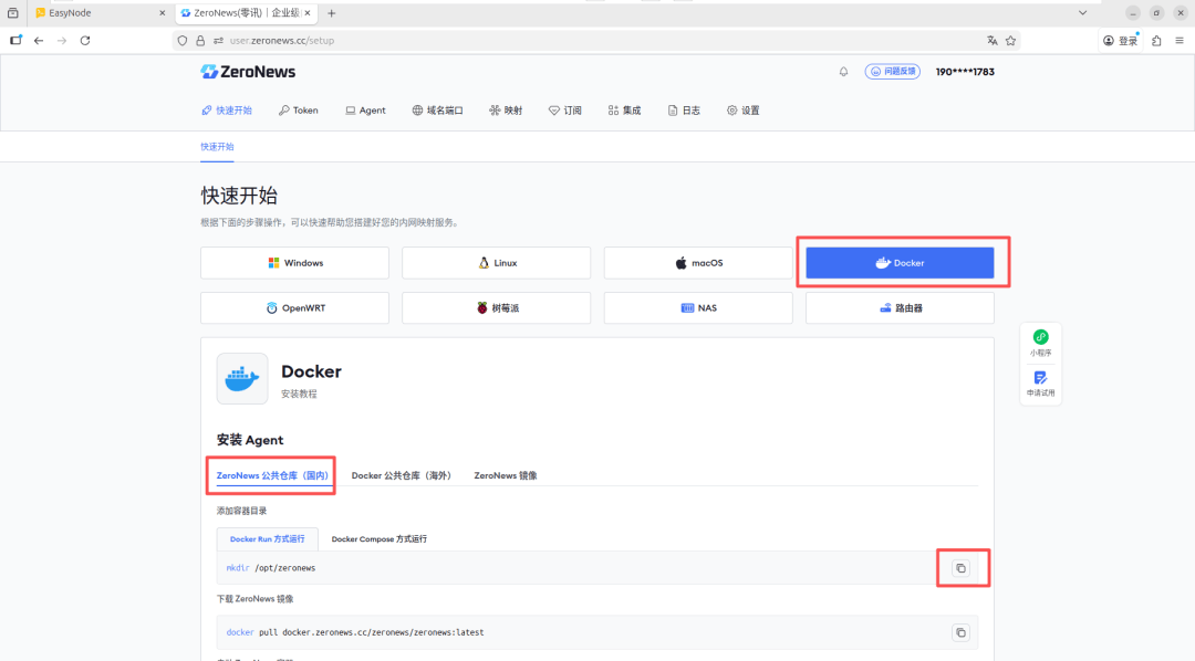 ① 首先,打开 ZeroNews 网站,我们选择Docker/ZeroNews公共仓库(国内),然后选择以 DokcerRun 方式运行,然后按照步骤复制对应的命令到Docker进行安装。