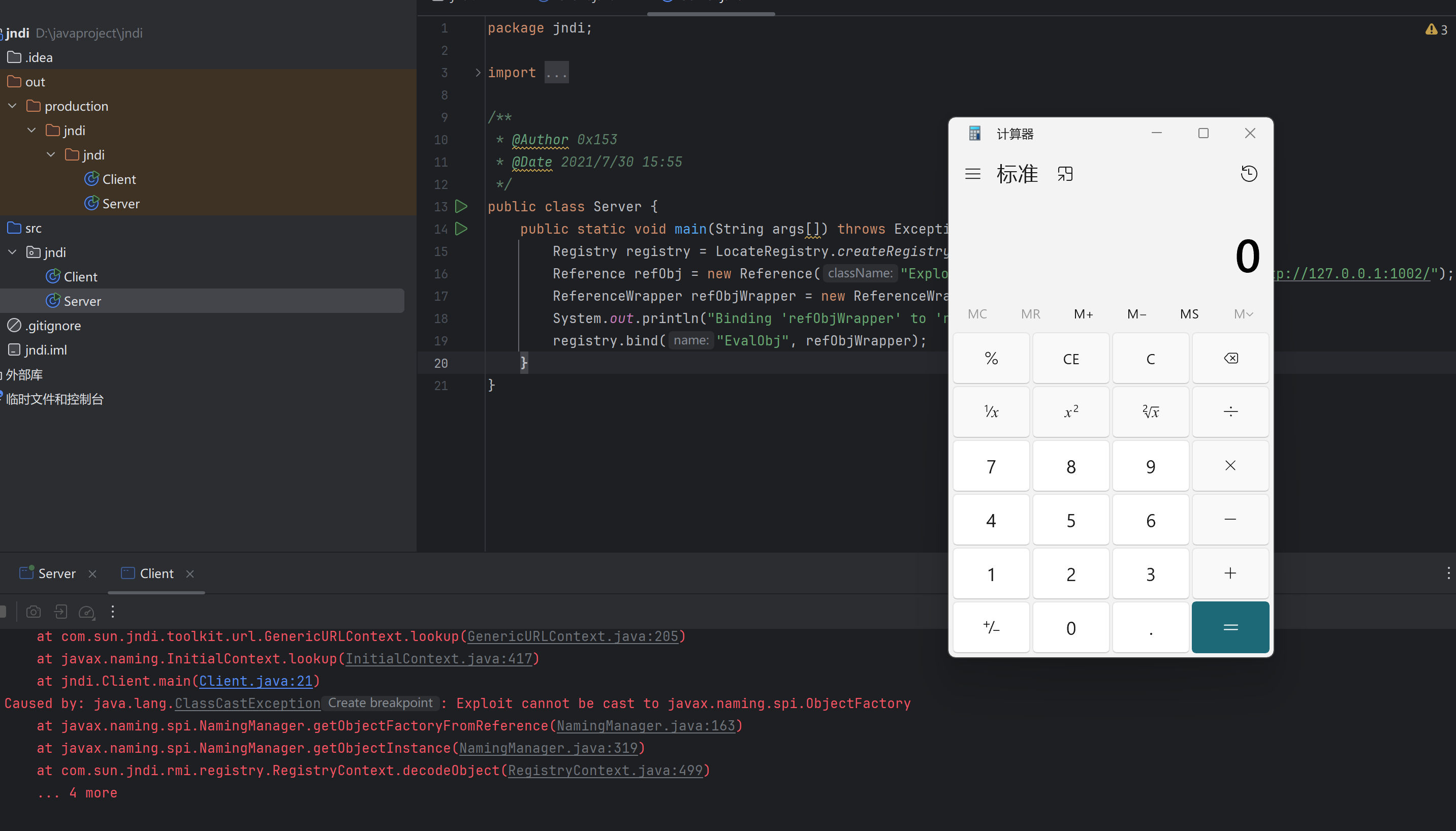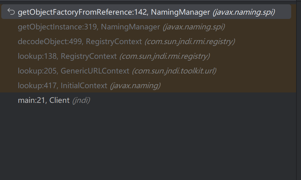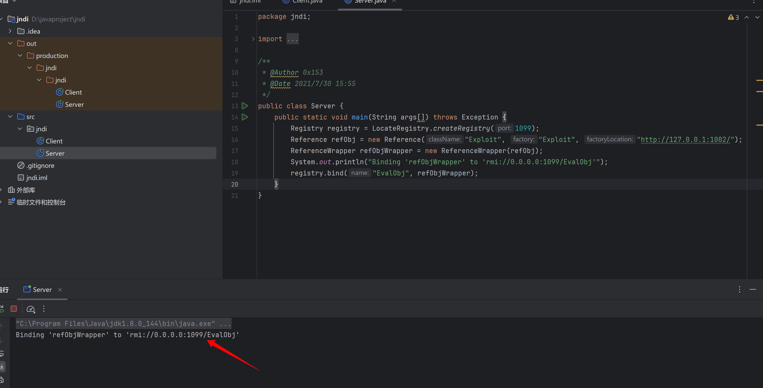 起一个端口1099的注册表,把/EvalObj这个路径绑定到⼀个Reference上,注册了远程对象,这样当client本地没有Exploit类时就会去访问http://127.0.0.1:1002/加载远程对象。