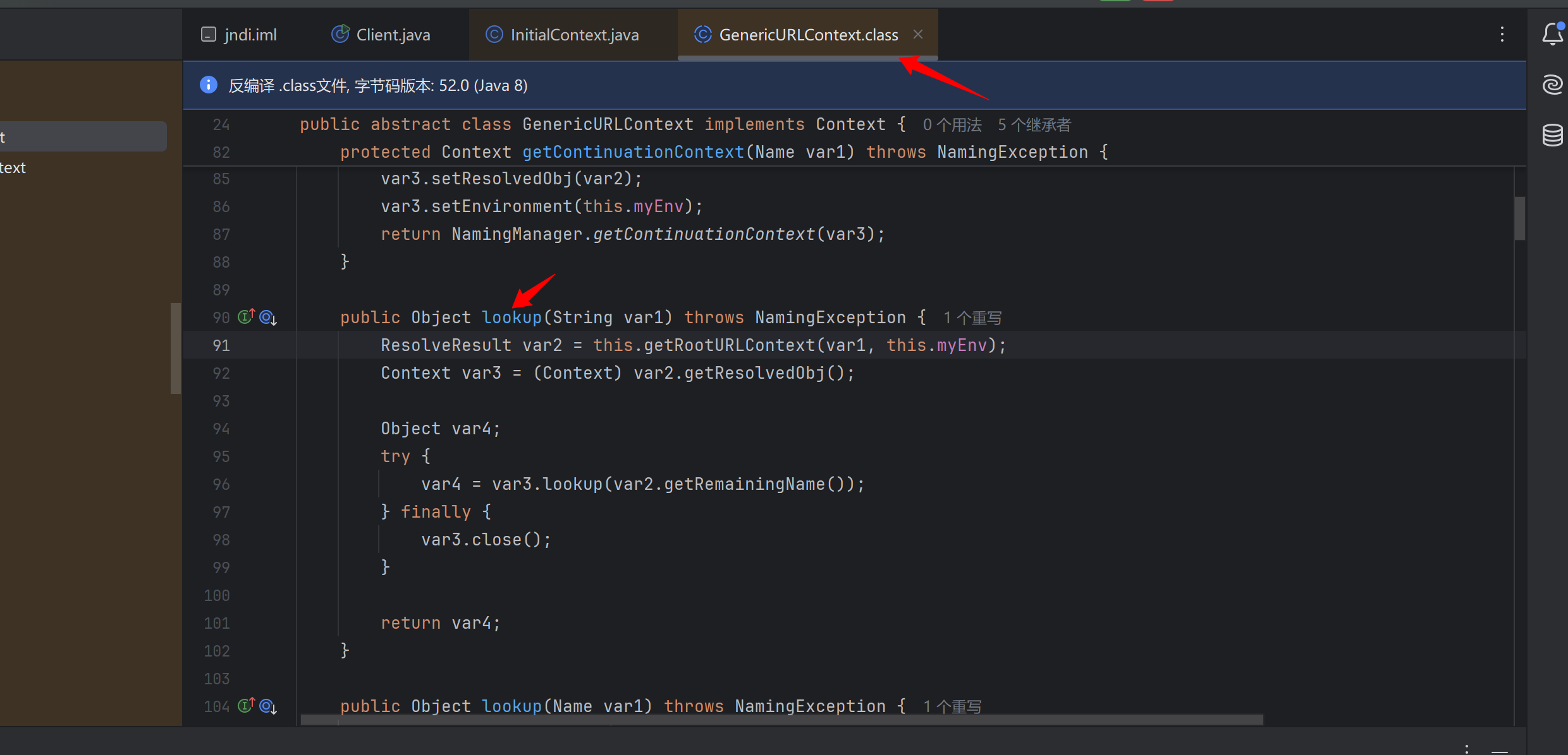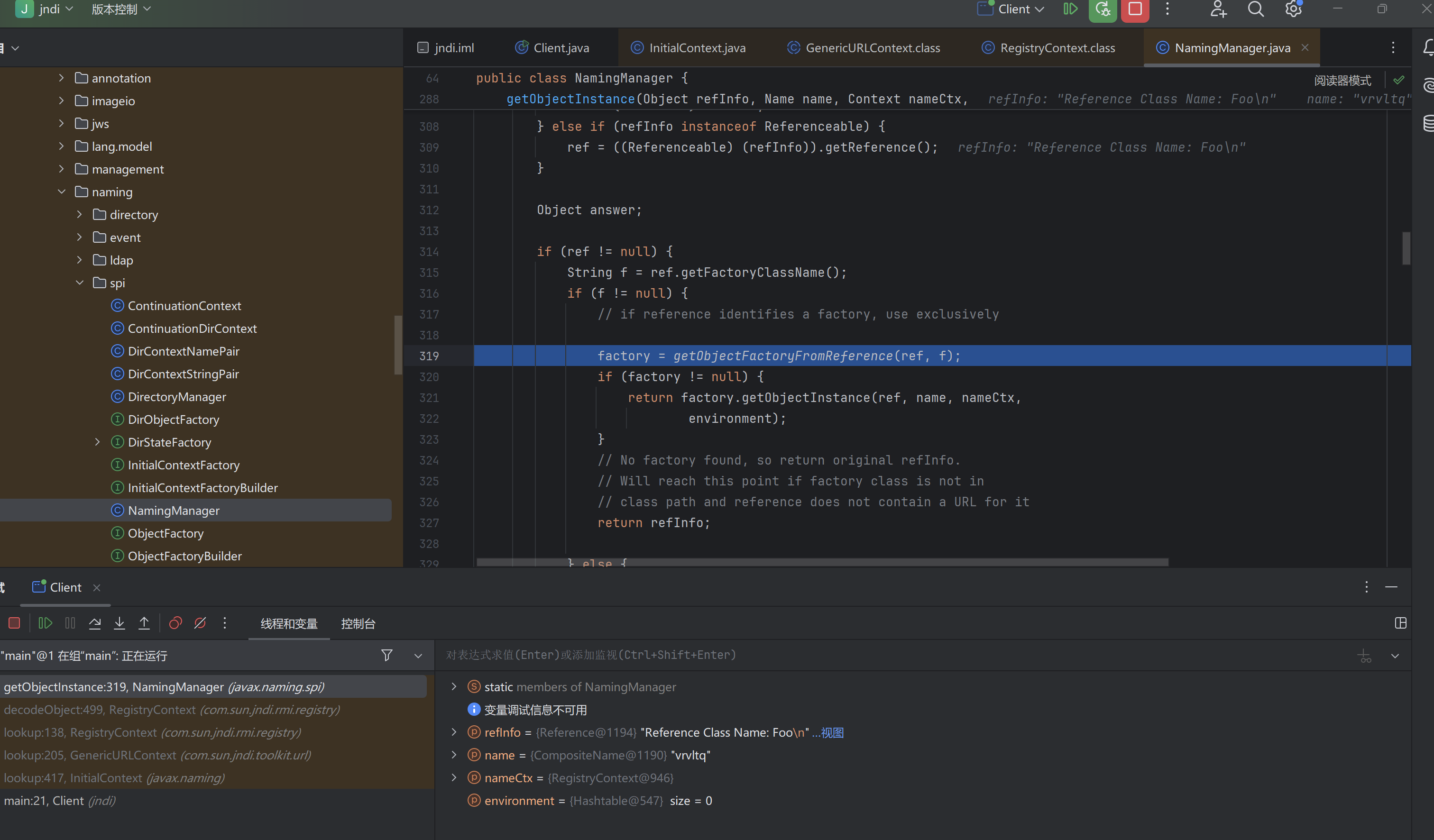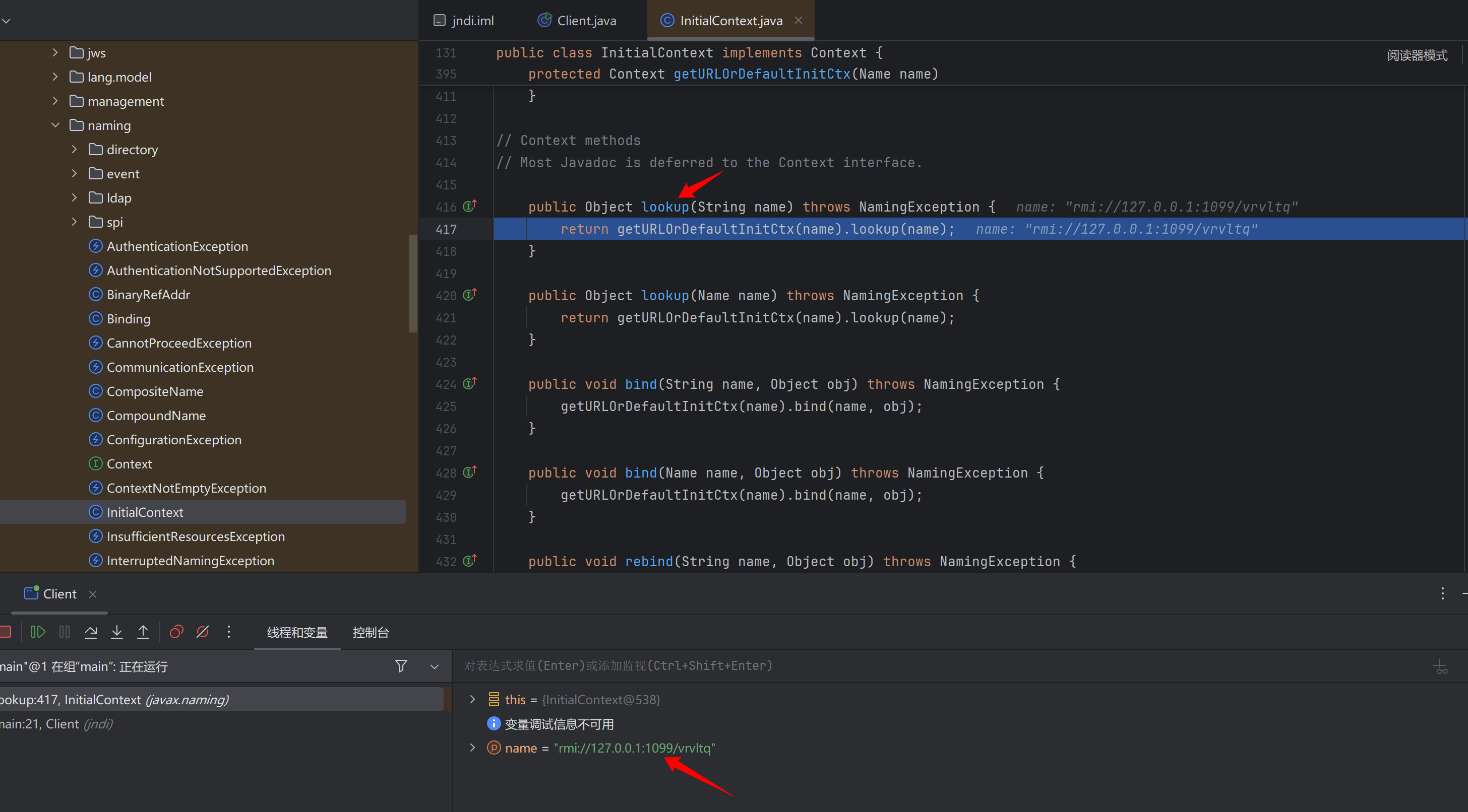到这儿就能清晰了 本质上还是InitialContext调用lookup()函数