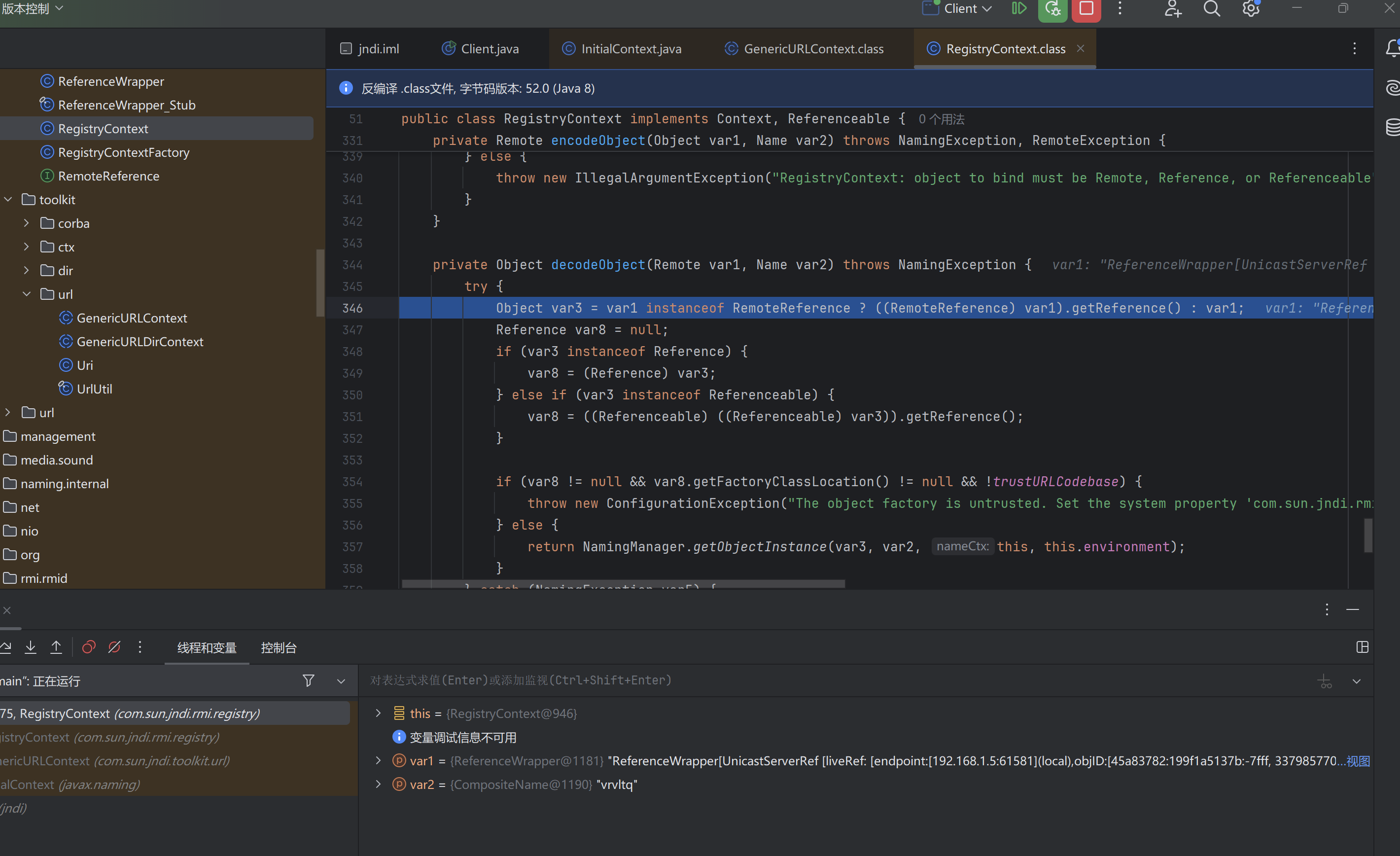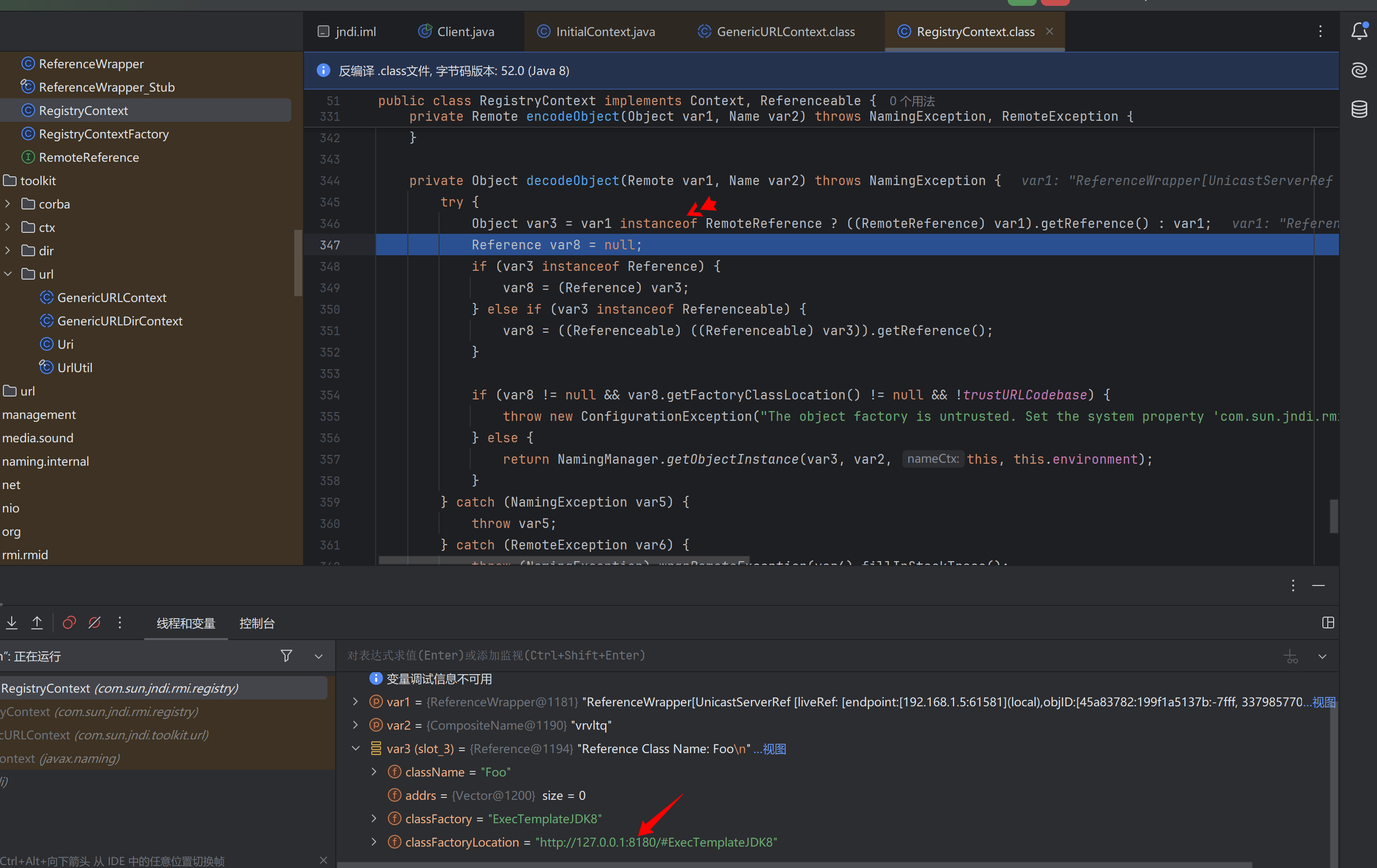 在decodeObject中,会判断传⼊对象是满⾜RemoteReference接⼝,满⾜则通过getReference函数获取reference对象