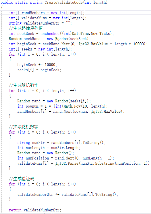 CreateValidateCode函数用于生成指定长度的数字字符串(长度为length),其主要实现逻辑为: