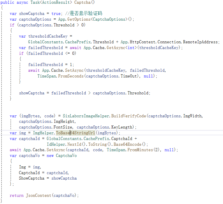 生成验证码及验证码图片的函数是Ape.Volo.Api项目的控制器类AuthorizationController的Captcha函数,主要代码如下图所示。函数的前半部分检查客户端输入的验证码次数,尝试的失败次数超过配置的次数限制则显示验证码,失败次数保存在缓存中,key值为固定字符串+客户端IP地址,数据超时时间在配置文件的Captcha节的TimeOut值配置。函数的后半部分根据Captcha节配置生成验证码及对应的图片,生成函数为Ape.Volo.Common项目的SixLaborsImageHelper.BuildVerifyCode函数,生成的验证码图片被编码为base64字符串,连同验证码及验证码标识一并发送给客户端。验证码也保存在服务端的缓存内,有2分钟的时效性。