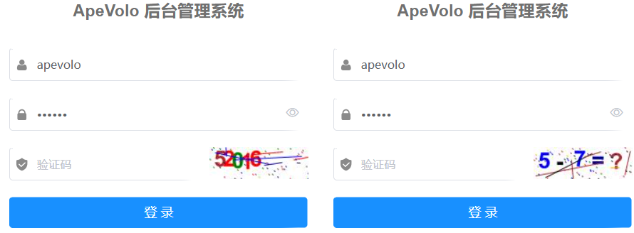 Ape.Volo项目支持两种验证码方式:数字及数学公式,采用的验证码方式在Ape.Volo.Api项目的appsettings.json内的Captcha节配置,KeyLength属性值大于0时使用数字验证码,否则使用数学公式验证码。